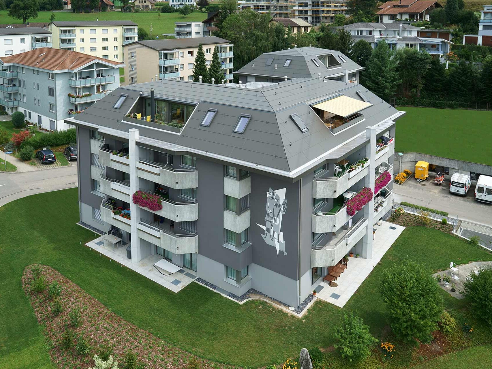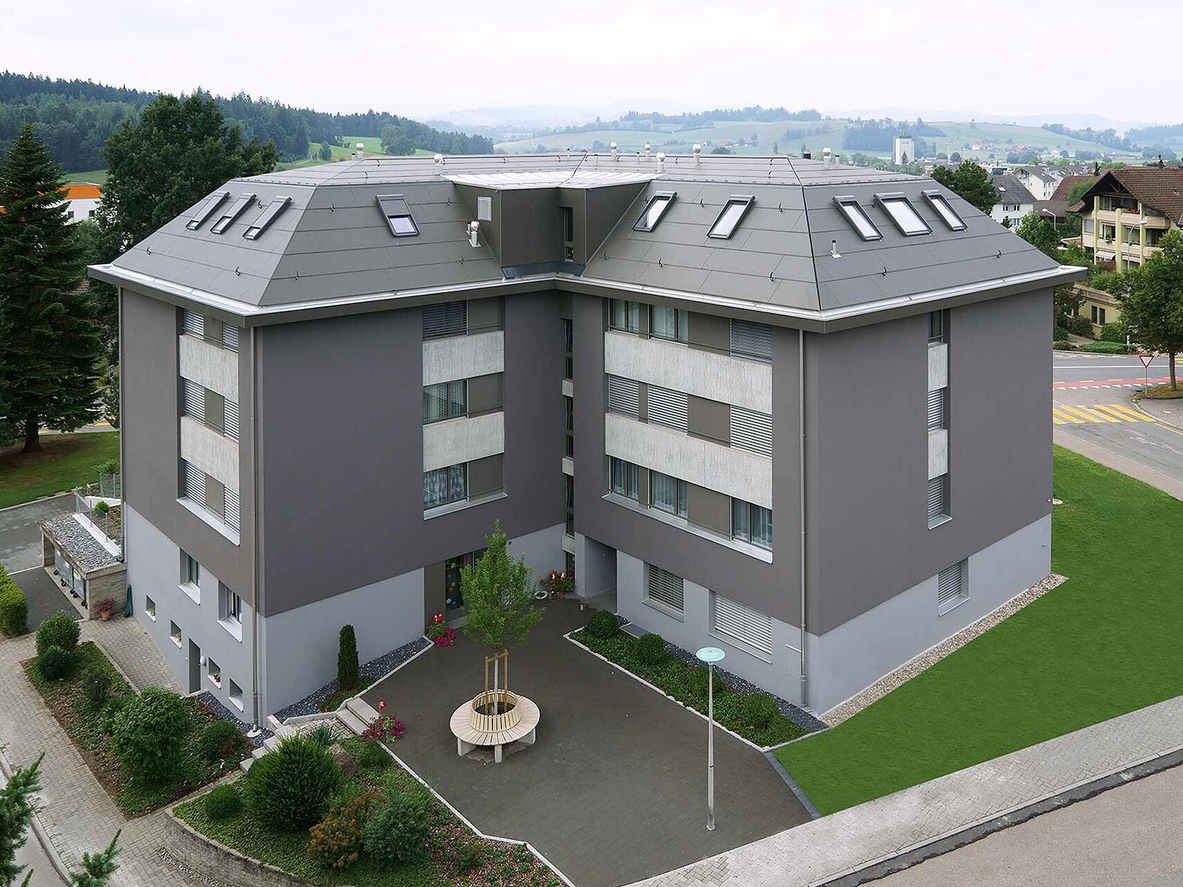 Die Wohngebäude an der Hellbühlerstrasse 15 und 17 wurden in nachhaltiger Holzbauweise aufgestockt. Durch den Einsatz von Holz als leichtes und umweltfreundliches Material wird zusätzlicher Wohnraum geschaffen, ohne die bestehende Gebäudestatik zu belasten. Die Aufstockung fügt sich nahtlos ins bestehende Ensemble ein und erhöht die Wohnqualität nachhaltig.