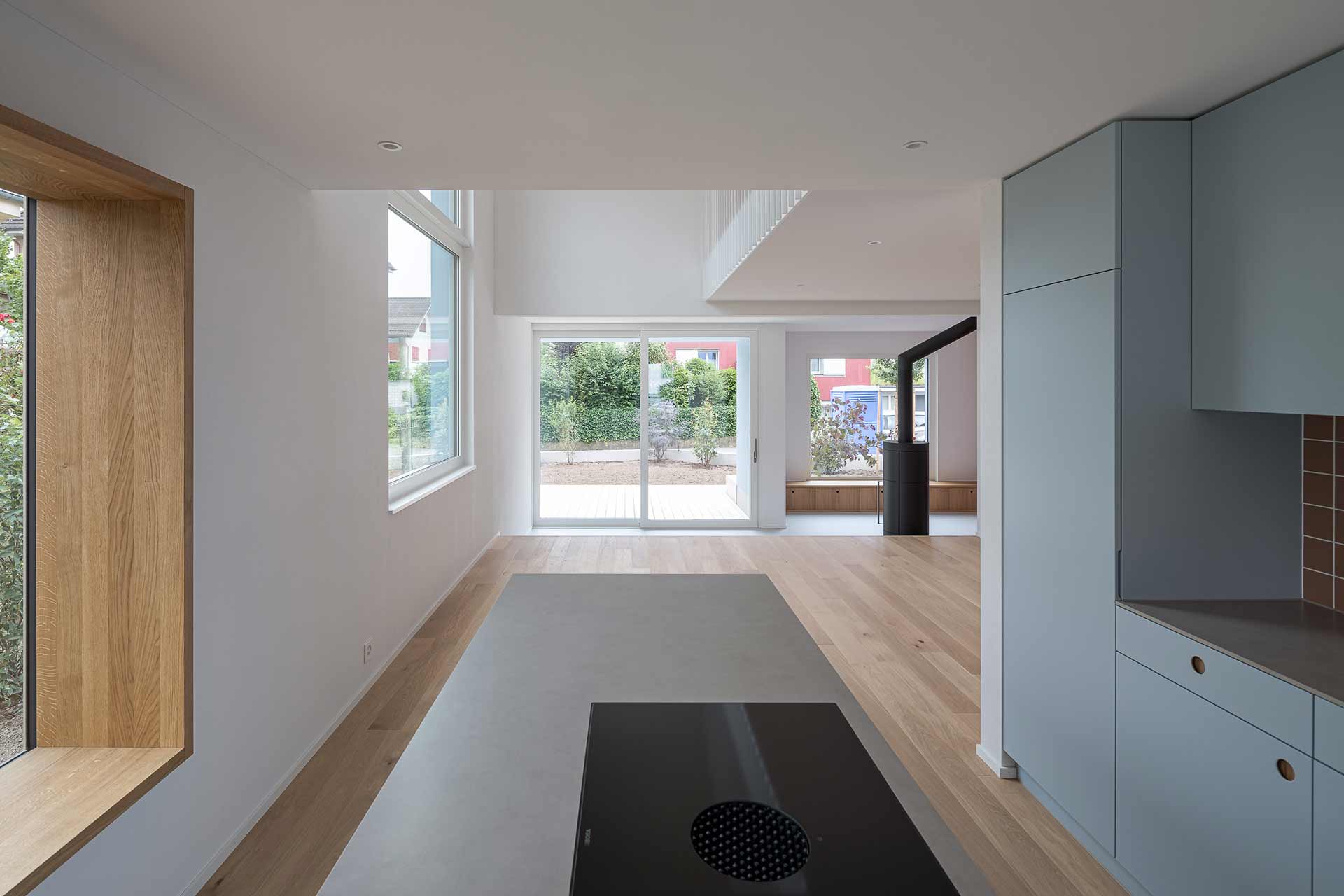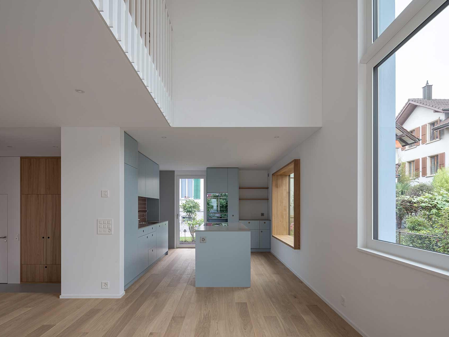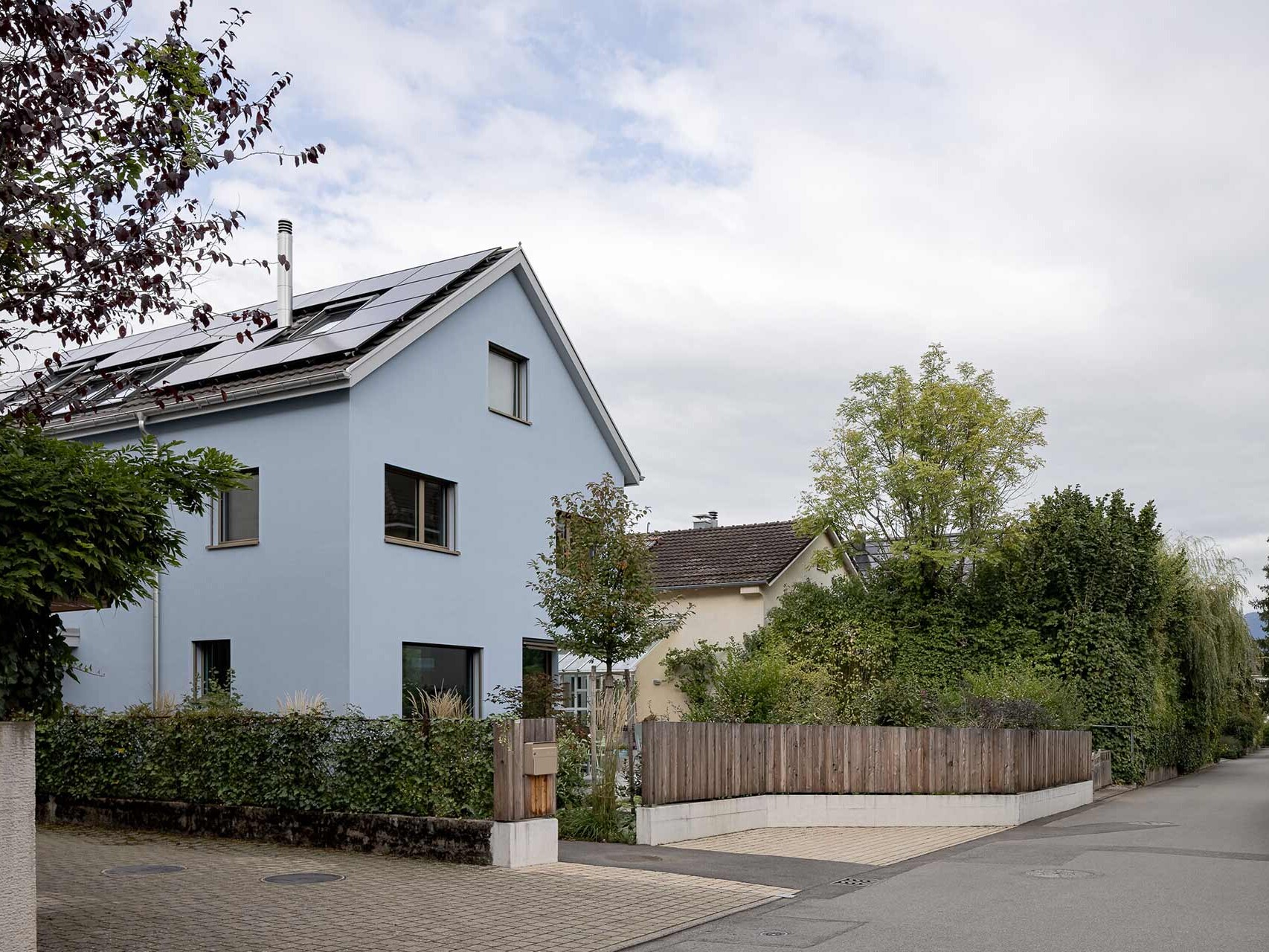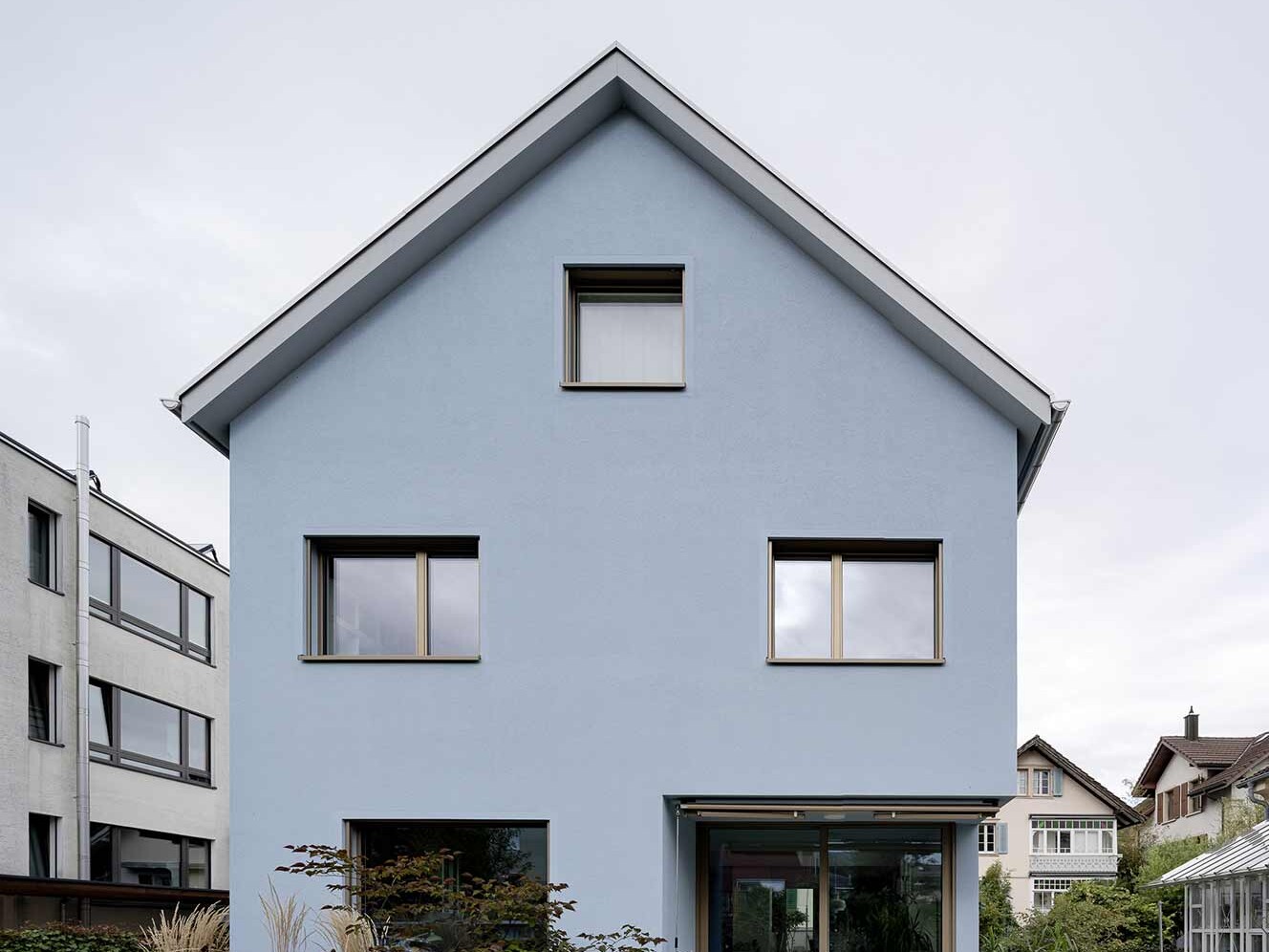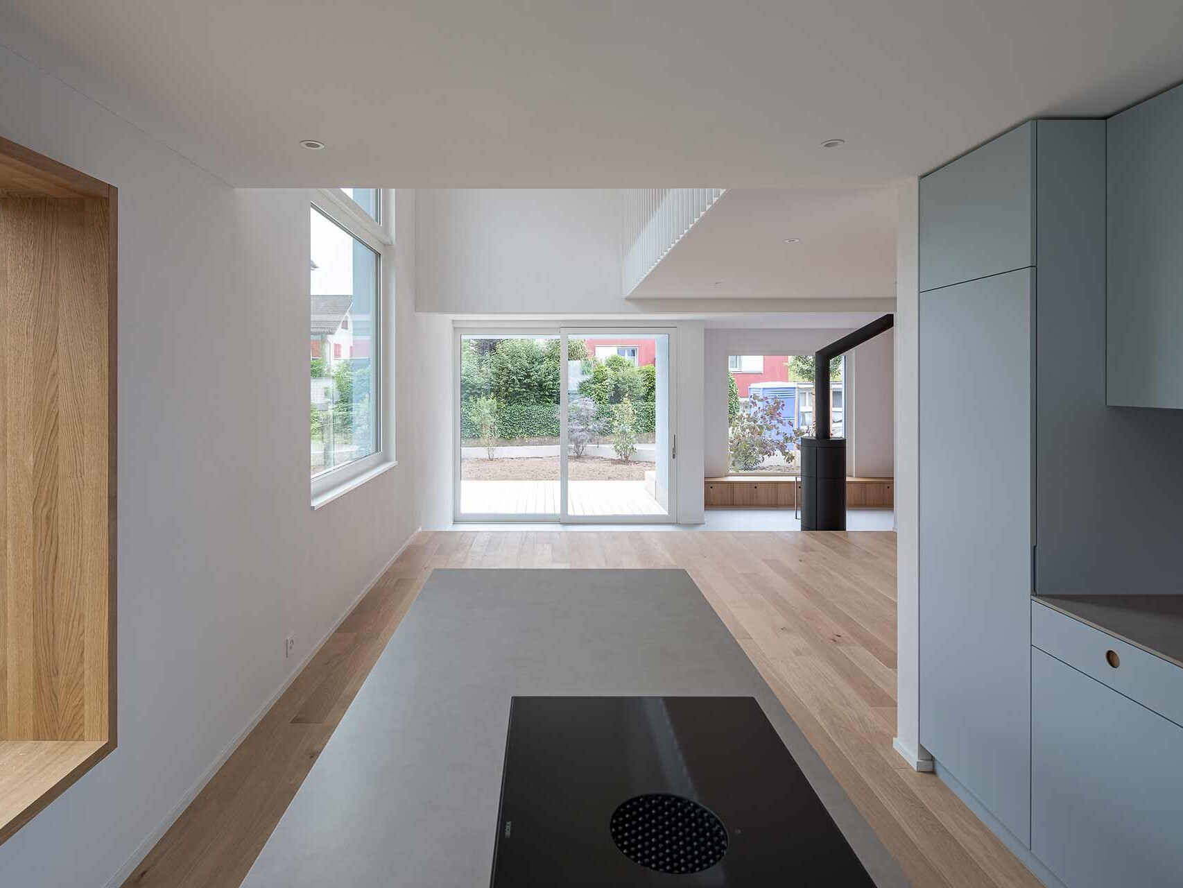 Der bestehende Bau wird durch ein neues Einfamilienhaus in Holzbauweise ersetzt. Der Neubau fügt sich selbstverständlich ins Quartier ein. Das Gebäudevolumen ist klar gegliedert. Die Fassade ist abgerieben und als Kompaktfassade ausgebildet. Der Sockel ist leicht abgesetzt und betont die horizontale Gliederung. Im Innern bildet der Essbereich das Zentrum des Hauses. Die offene Raumstruktur mit überhohem Luftraum schafft Grosszügigkeit und verbindet die Geschosse visuell miteinander.