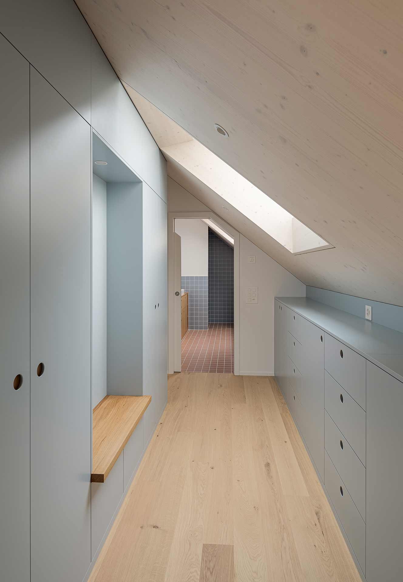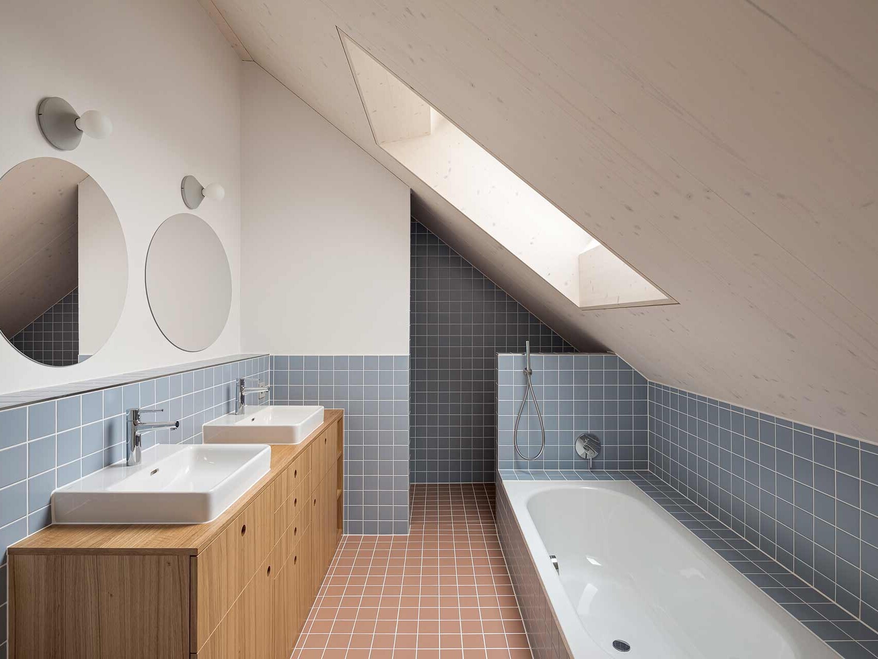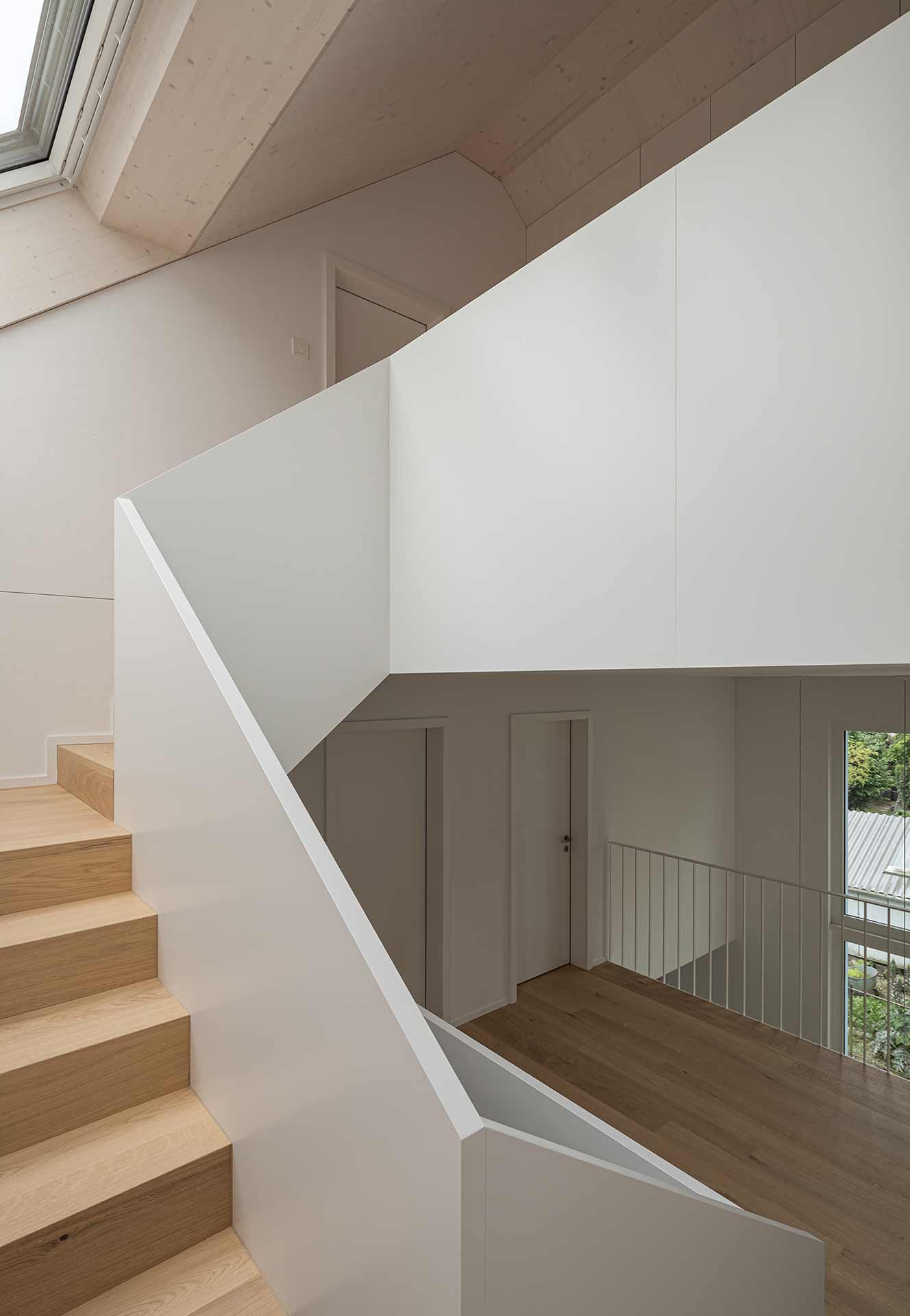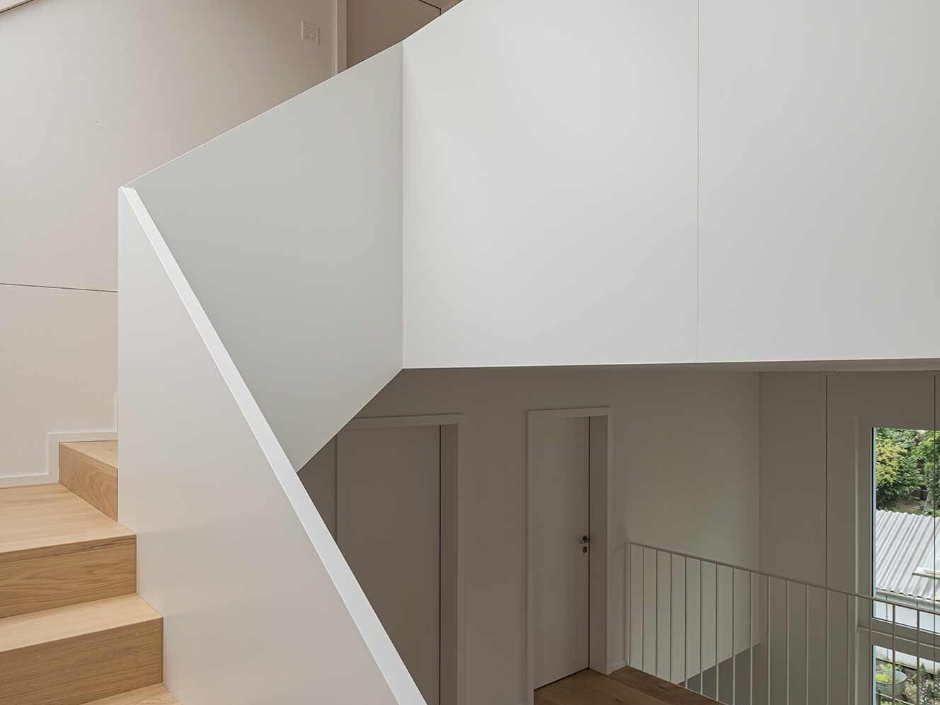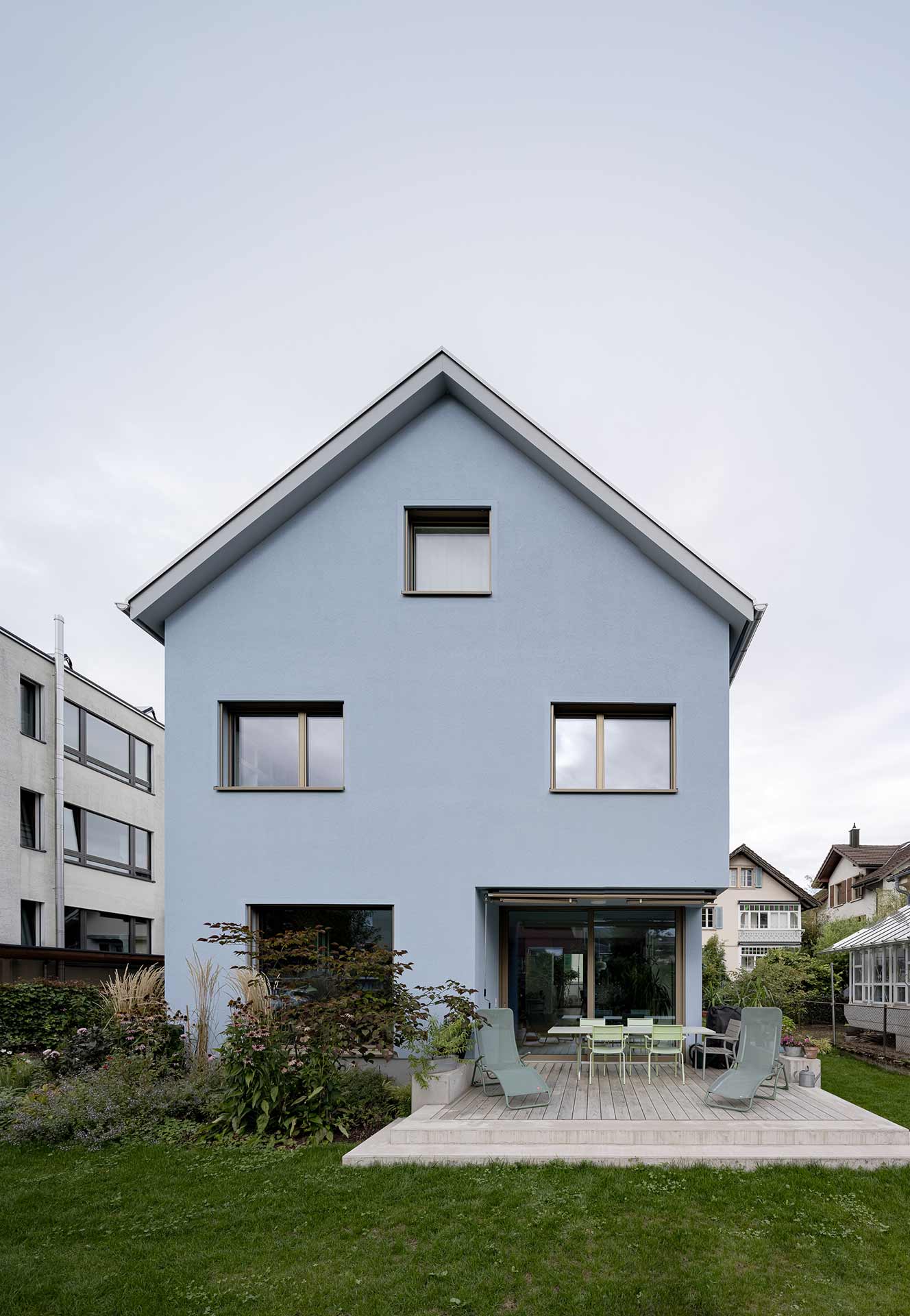 Der bestehende Bau wird durch ein neues Einfamilienhaus in Holzbauweise ersetzt. Der Neubau fügt sich selbstverständlich ins Quartier ein. Das Gebäudevolumen ist klar gegliedert. Die Fassade ist abgerieben und als Kompaktfassade ausgebildet. Der Sockel ist leicht abgesetzt und betont die horizontale Gliederung. Im Innern bildet der Essbereich das Zentrum des Hauses. Die offene Raumstruktur mit überhohem Luftraum schafft Grosszügigkeit und verbindet die Geschosse visuell miteinander.