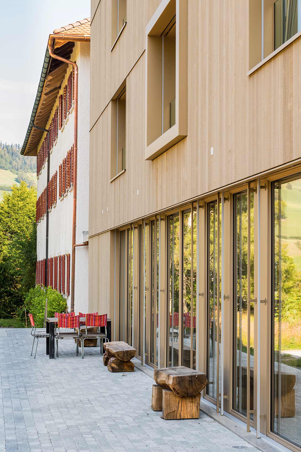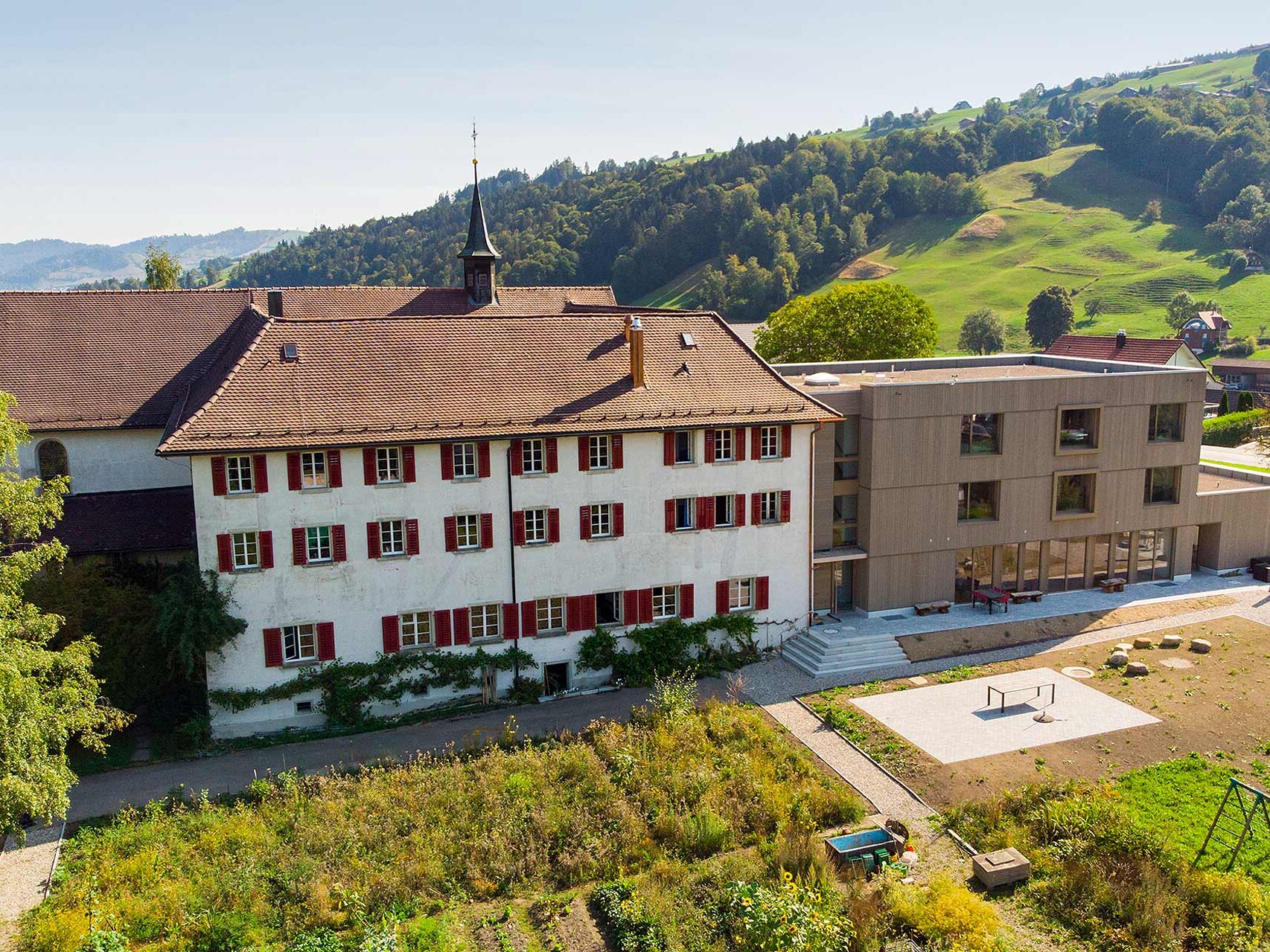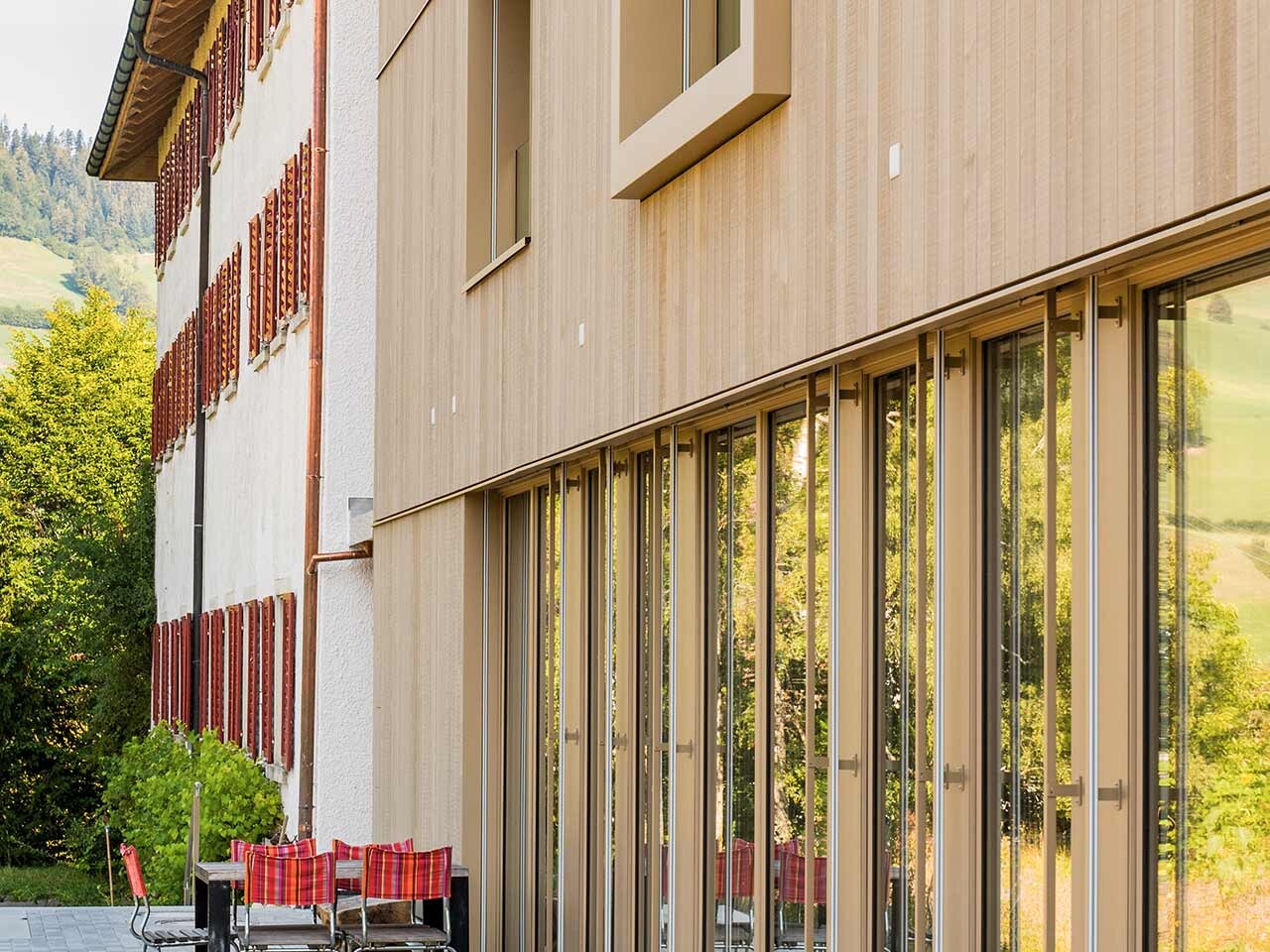 Das Kapuzinerkloster Schüpfheim wurde 1653 gegründet und steht unter Denkmalschutz. Heute bietet das Kloster Menschen in schwierigen Lebenssituationen ein vorübergehendes Zuhause. Der Ersatzneubau wurde den Bedürfnissen der Anwohner angepasst. Das Holzbau-Team war für Roh- und Ausbauarbeiten, sämtliche Holzelemente, Innen- und Aussenverkleidungen und die Erstellung des Treppenhauses zuständig. Bei den Fenstern wurde das System Haupt Antico in Holz eingesetzt.