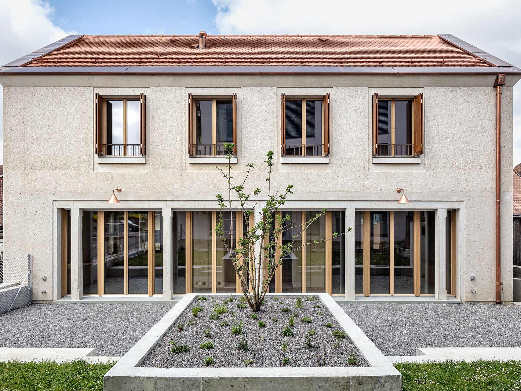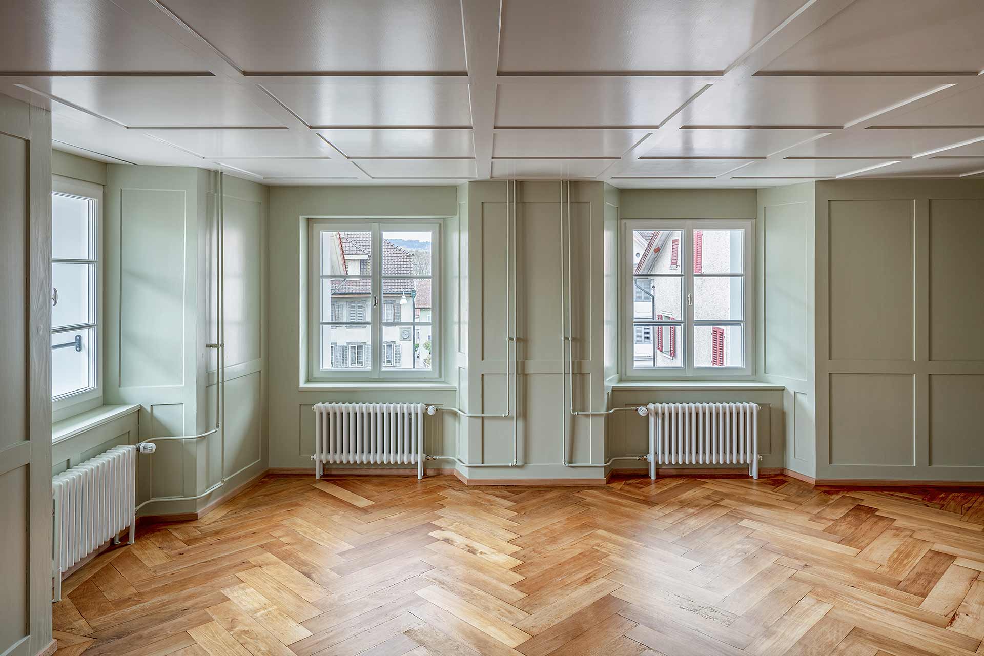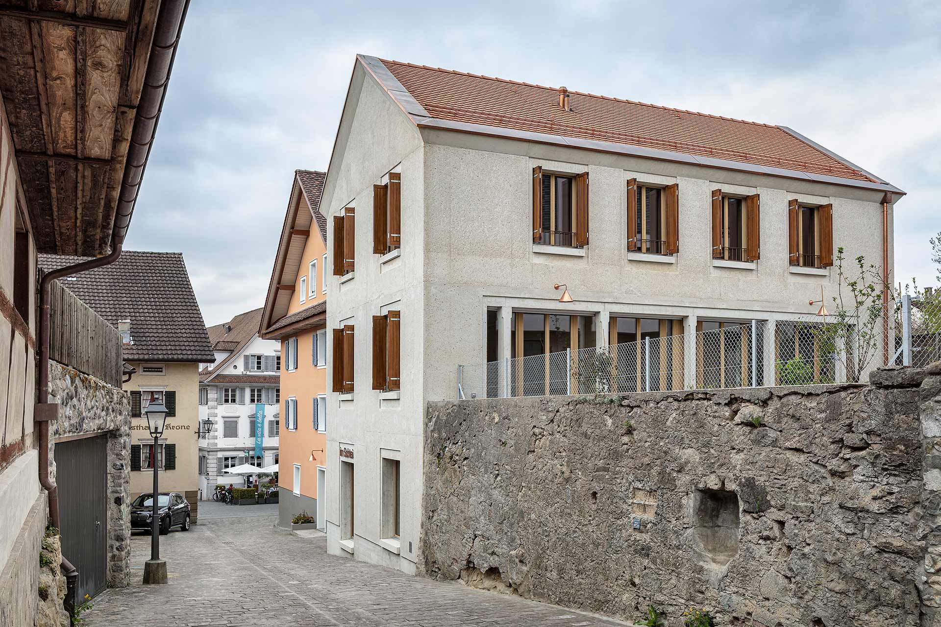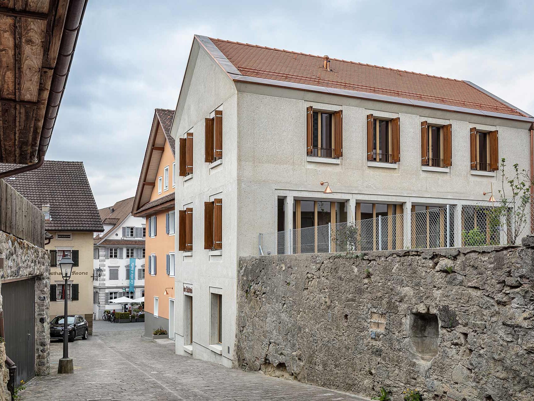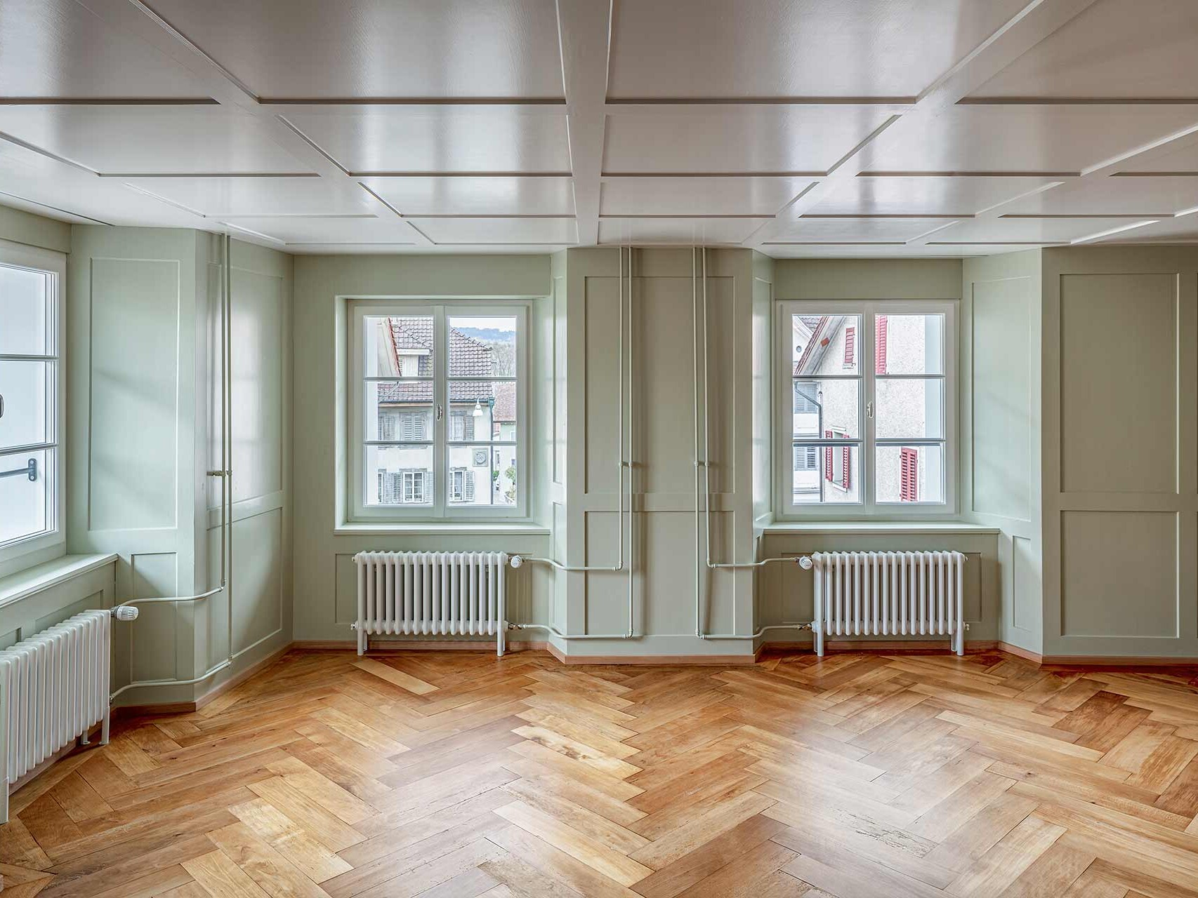 In Zusammenarbeit mit der Denkmalpflege wurde der Altbau sanft saniert. Der Neubau nimmt sich gegenüber dem Bestand zurück und integriert sich optimal. Für den Neubau wie auch für den Fensterersatz wurde das Haupt Cultura in Holz gewählt.