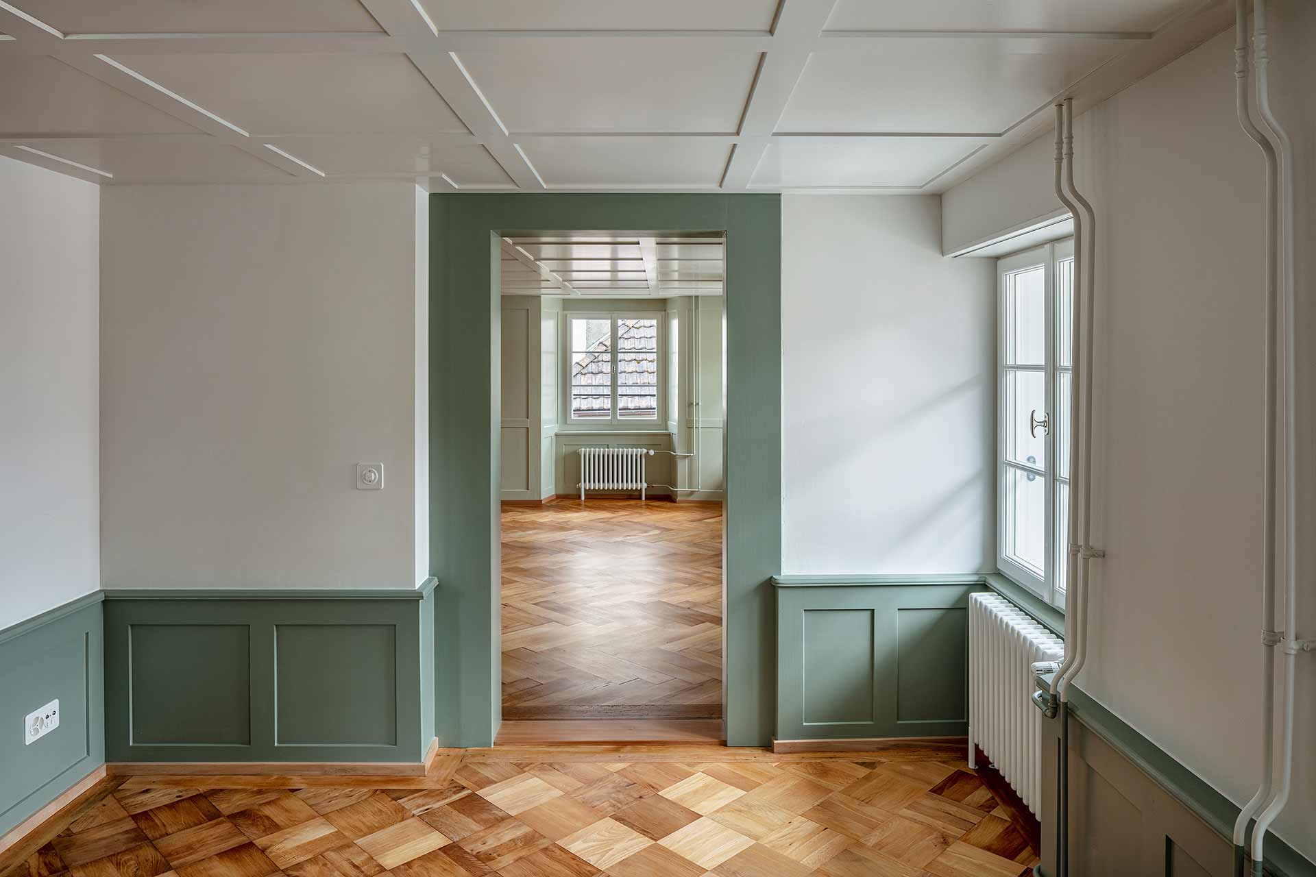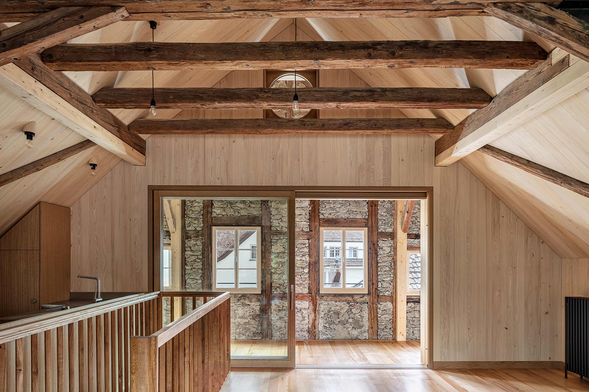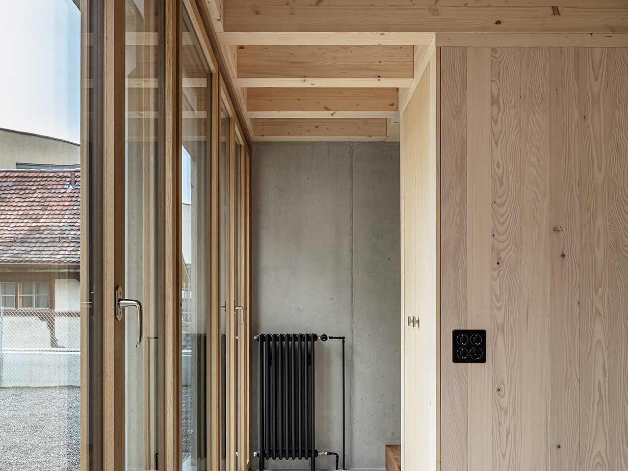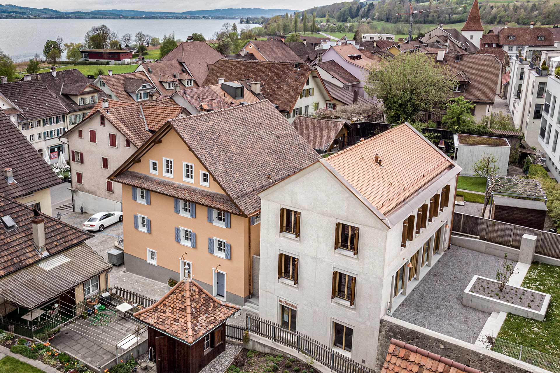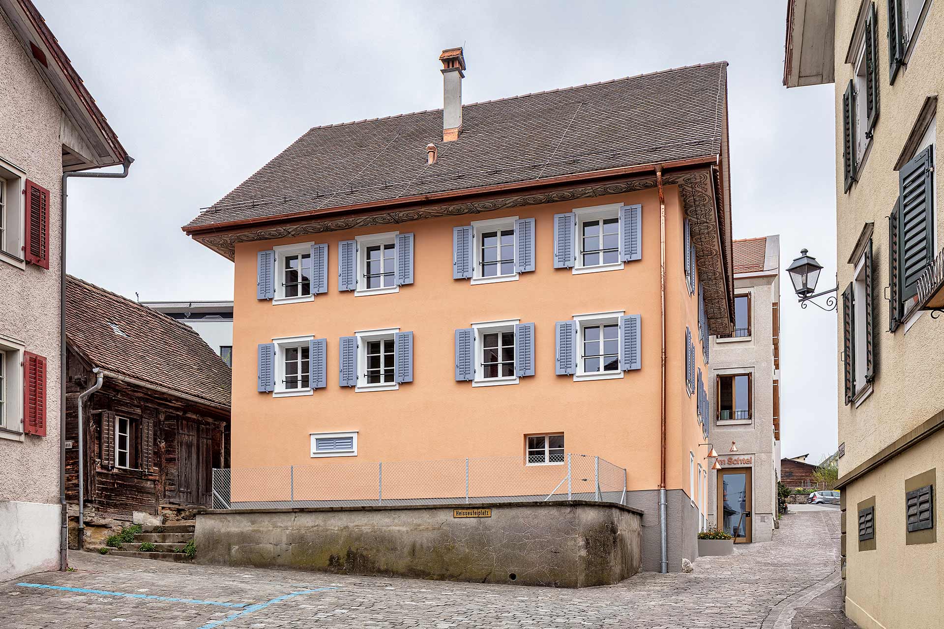 In Zusammenarbeit mit der Denkmalpflege wurde der Altbau sanft saniert. Der Neubau nimmt sich gegenüber dem Bestand zurück und integriert sich optimal. Für den Neubau wie auch für den Fensterersatz wurde das Haupt Cultura in Holz gewählt.