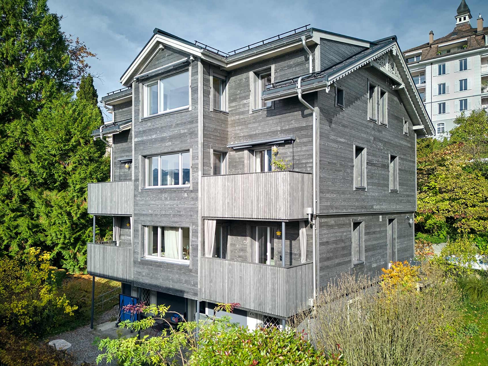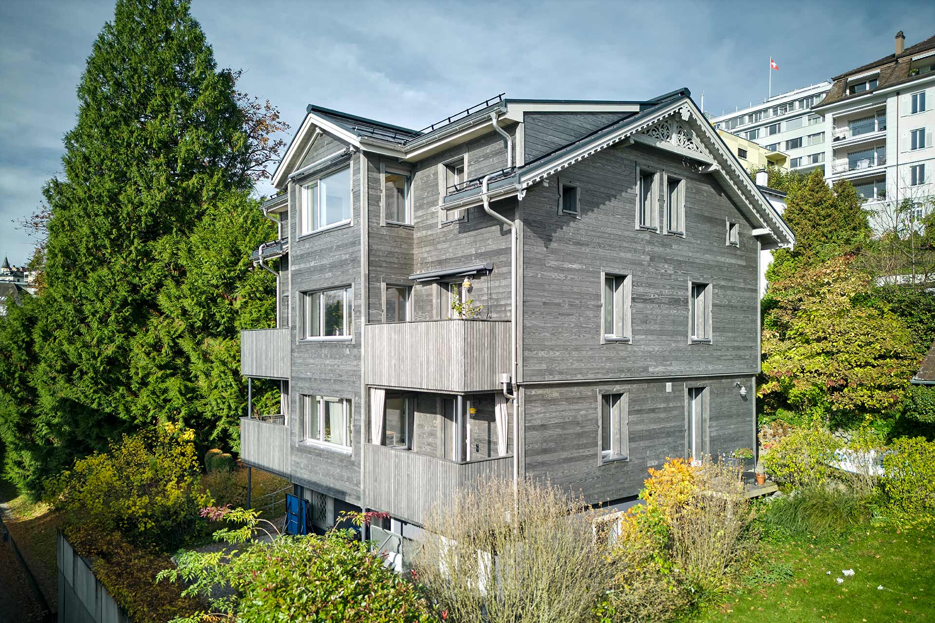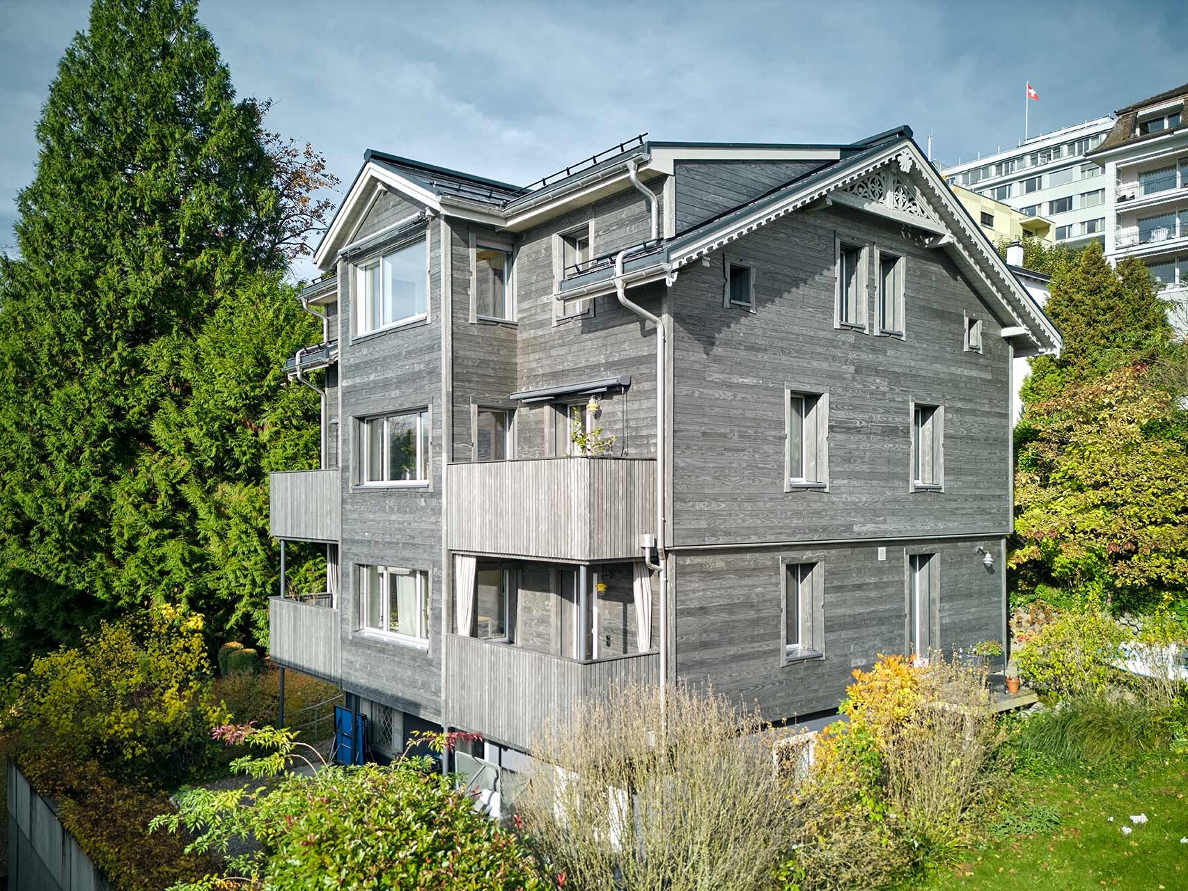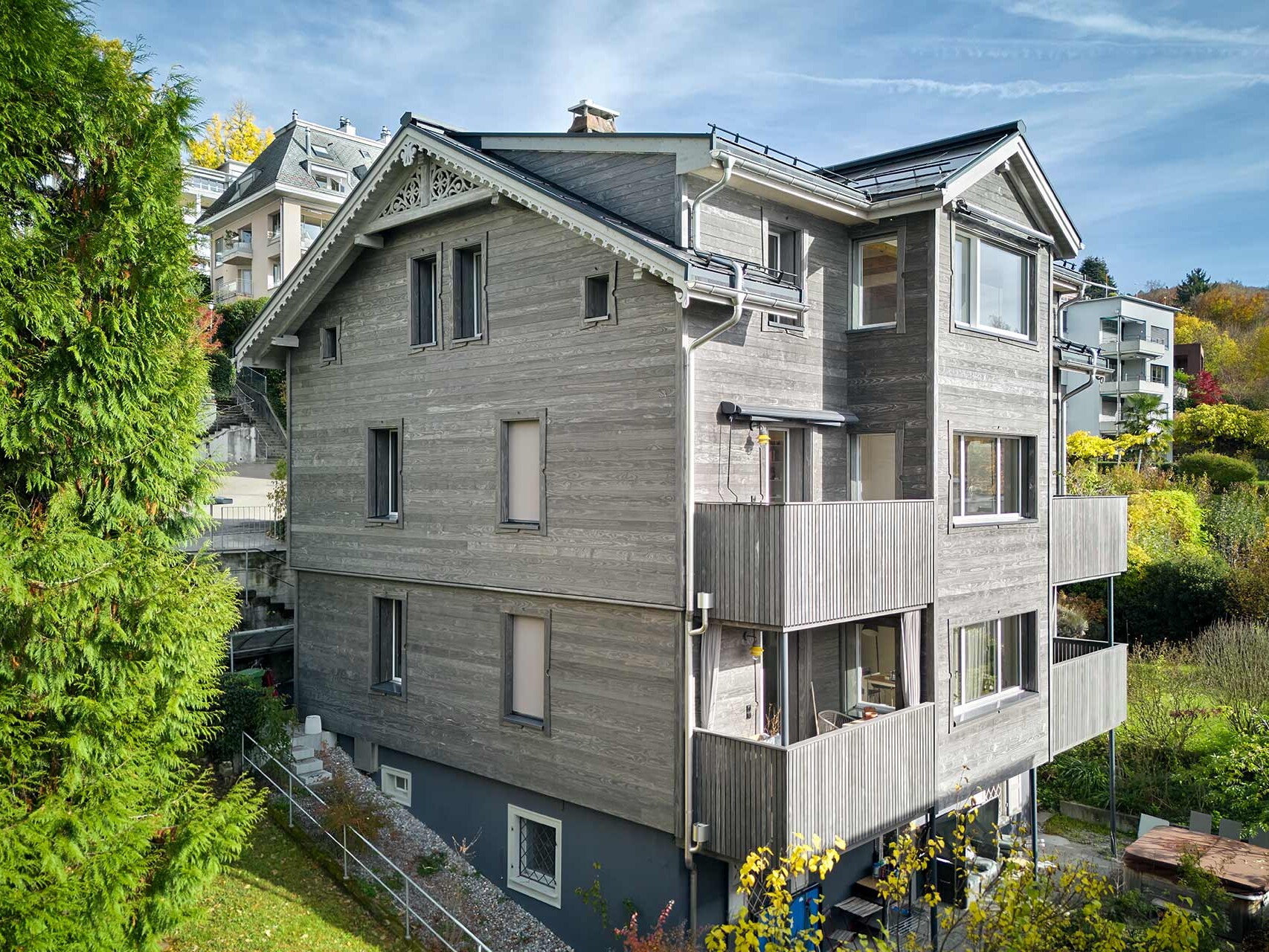 Im Rahmen der Dach- und Fassadensanierung dieses Mehrfamilienhauses durften wir die Holzbauausführung realisieren. Zum Einsatz kam Accoya Color Grey für die Fassadenbekleidung. Die hochwertige, silbergraue Oberfläche verleiht dem Gebäude eine zeitlose Ausstrahlung und fügt sich harmonisch in die Umgebung ein. Die präzise Umsetzung unterstreicht die Langlebigkeit und Qualität der gewählten Holzlösung.