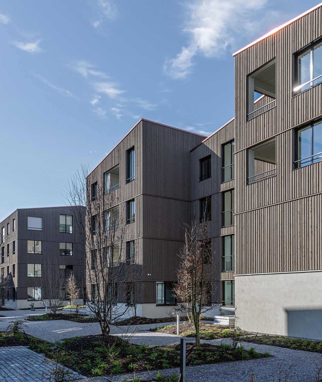 Die Gebäude sind in Hybridbauweise gebaut. Die Treppenkerne und Geschossdecken sind Beton, die Aussenwände aus Holzelementen mit hinterlüfteter Holzschalung. Das Projekt wurde nach den Kriterien «Standard Nachhaltiges Bauen Schweiz» (SNBS) entwickelt, welche u. a. einen ökologischen Materialeinsatz sowie eine nachhaltige Bauweise im Betrieb und Unterhalt zum Ziel haben.